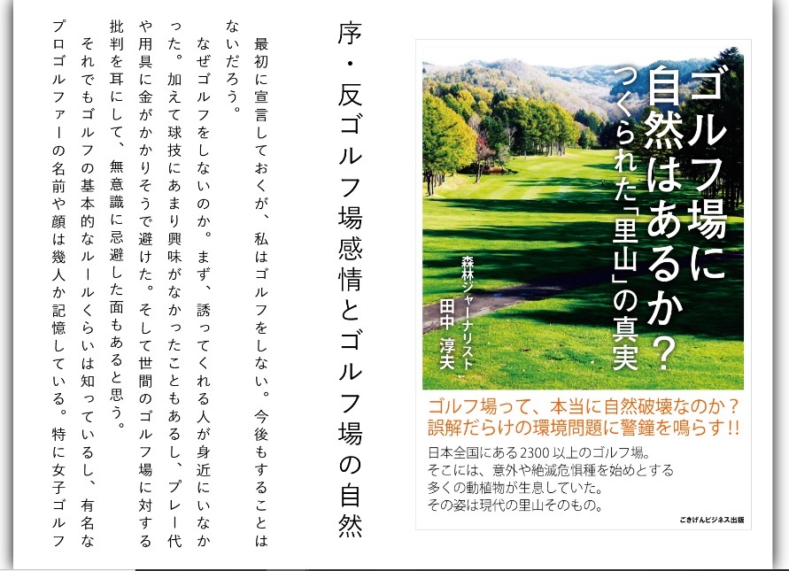 NET検索でトップに表示されたのはJSGCA(日本ゴルフコース設計者協会)という業界団体のホームページでしたが、筆者は2番目に出てきた「環境破壊は本当か?ゴルフ場開発への誤解」というブログ記事の中にあった、自称 “日本唯一の森林ジャーナリスト” 田中淳夫さん著「ゴルフ場は自然がいっぱい(ちくま新書) 」というタイトルの本に惹かれました。さらにNET情報をたどってみると、同書が既に絶版になっていて現在は、「ゴルフ場に自然はあるか? つくられた『里山』の真実」というタイトルで電子書籍(ごきげんビジネス出版)になっていることがわかりました。